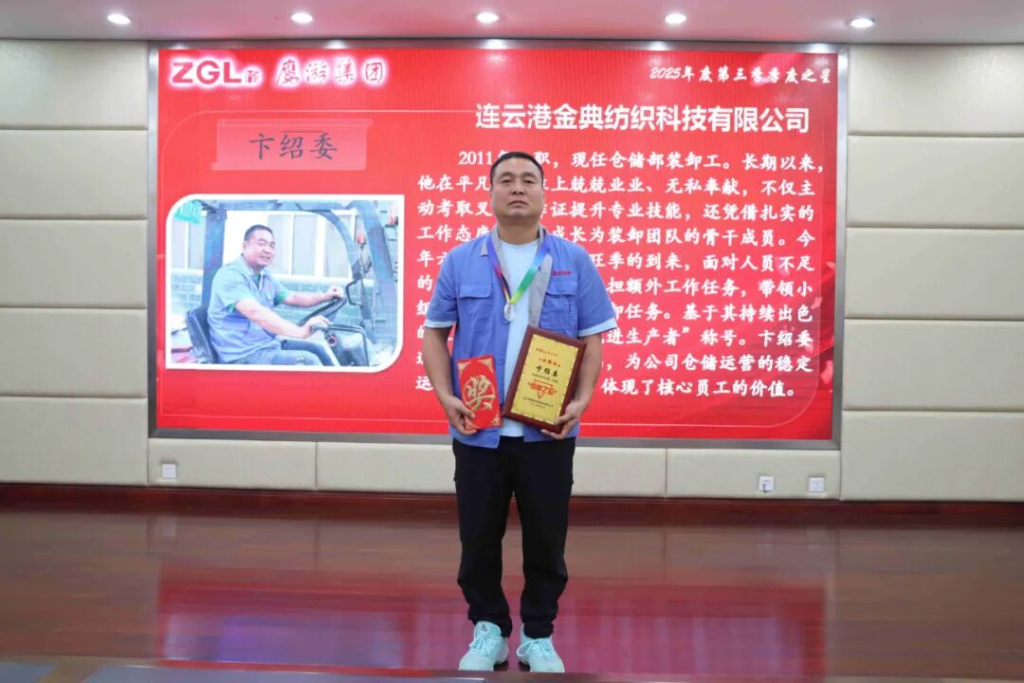 卞紹委,2011年加入金典紡織科技公司,現(xiàn)任倉儲部裝卸工。他積極進取,主動考取叉車操作證,提升專業(yè)能力,逐步成長為裝卸團隊的骨干。工作中,主動承擔額外任務(wù),帶頭攻堅,帶領(lǐng)小組高效完成繁重裝卸工作,每日加班無怨無悔,有力保障了生產(chǎn)連續(xù)性,體現(xiàn)出顯著的模范帶頭作用。因其持續(xù)出色的表現(xiàn),多次獲評“先進生產(chǎn)者”稱號。