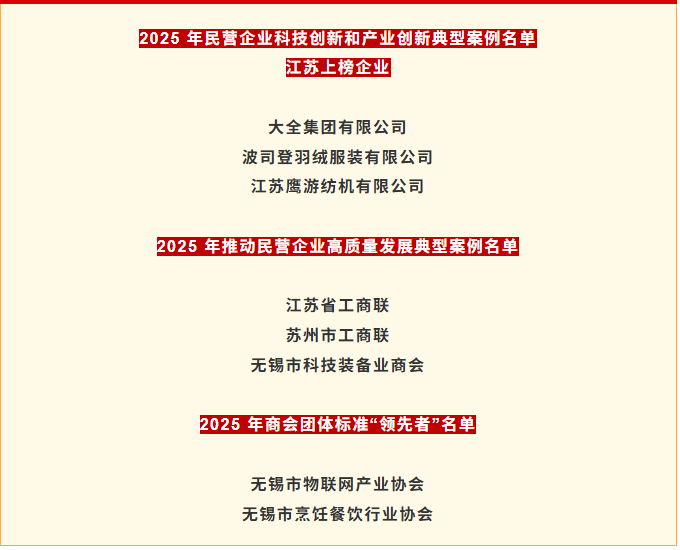 會上,發(fā)布了2025研發(fā)投入前1000家民營企業(yè)創(chuàng)新狀況報告和民營企業(yè)研發(fā)投入、發(fā)明專利榜單,民營企業(yè)發(fā)展新質(zhì)生產(chǎn)力系列典型案例、商會團(tuán)體標(biāo)準(zhǔn)“領(lǐng)先者”名單。其中,江蘇77家民營企業(yè)入圍“2025民營企業(yè)研發(fā)投入500 家”、62家民營企業(yè)入圍“2025民營企業(yè)發(fā)明專利500 家”;大全集團(tuán)有限公司、波司登羽絨服裝有限公司、江蘇鷹游紡機(jī)有限公司3家企業(yè)入選“2025年民營企業(yè)科技創(chuàng)新和產(chǎn)業(yè)創(chuàng)新典型案例名單”;江蘇省工商聯(lián)、蘇州市工商聯(lián)、無錫市科技裝備業(yè)商會3家單位入選“2025年推動民營企業(yè)高質(zhì)量發(fā)展典型案例名單”;無錫市物聯(lián)網(wǎng)產(chǎn)業(yè)協(xié)會、無錫市烹飪餐飲行業(yè)協(xié)會2家商會標(biāo)準(zhǔn)入選2025年商會團(tuán)體標(biāo)準(zhǔn)“領(lǐng)先者”名單。江蘇上榜企業(yè)和單位數(shù)量均位居前列。