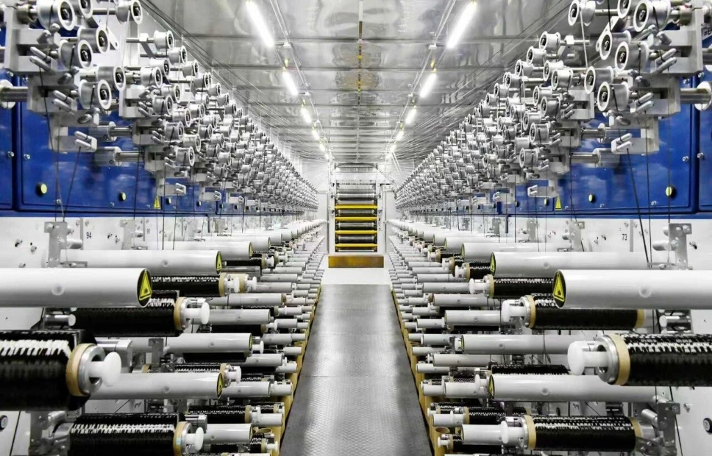 經(jīng)實驗室模擬測試,一束標(biāo)準(zhǔn)規(guī)格的T1200碳纖維可承受足以拉動兩架C919大飛機(jī)的載荷。在拉伸模量上,T1200介于T800S與T1100之間,密度略高于T1100,但其高強(qiáng)度特性仍能為制造業(yè)提供兼具高承載能力與輕量化潛力的材料。