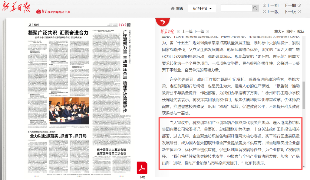 2月3日—6日,江蘇省第十四屆人民代表大會第五次會議在南京隆重召開。省人大代表、連云港鷹游紡機集團有限公司黨委書記、董事長、總經(jīng)理,中復(fù)神鷹碳纖維股份有限公司副董事長張斯緯肩負使命、認真履職盡責(zé),圍繞全省經(jīng)濟社會高質(zhì)量發(fā)展積極建言獻策,用實干踐行代表使命。